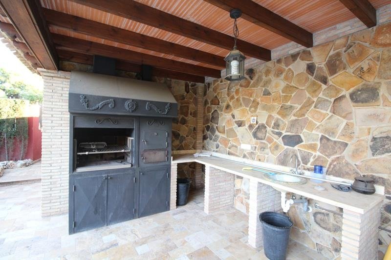 En el exterior, la villa ofrece una gran piscina privada rodeada de un cuidado jardín, con una preciosa cascada decorativa que aporta un ambiente de serenidad y elegancia. La zona de barbacoa y comedor al aire libre permite disfrutar del clima mediterráneo en total privacidad. La parcela, totalmente vallada, ofrece un entorno seguro y tranquilo.