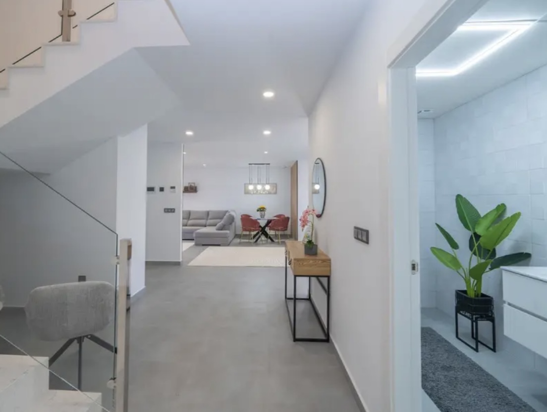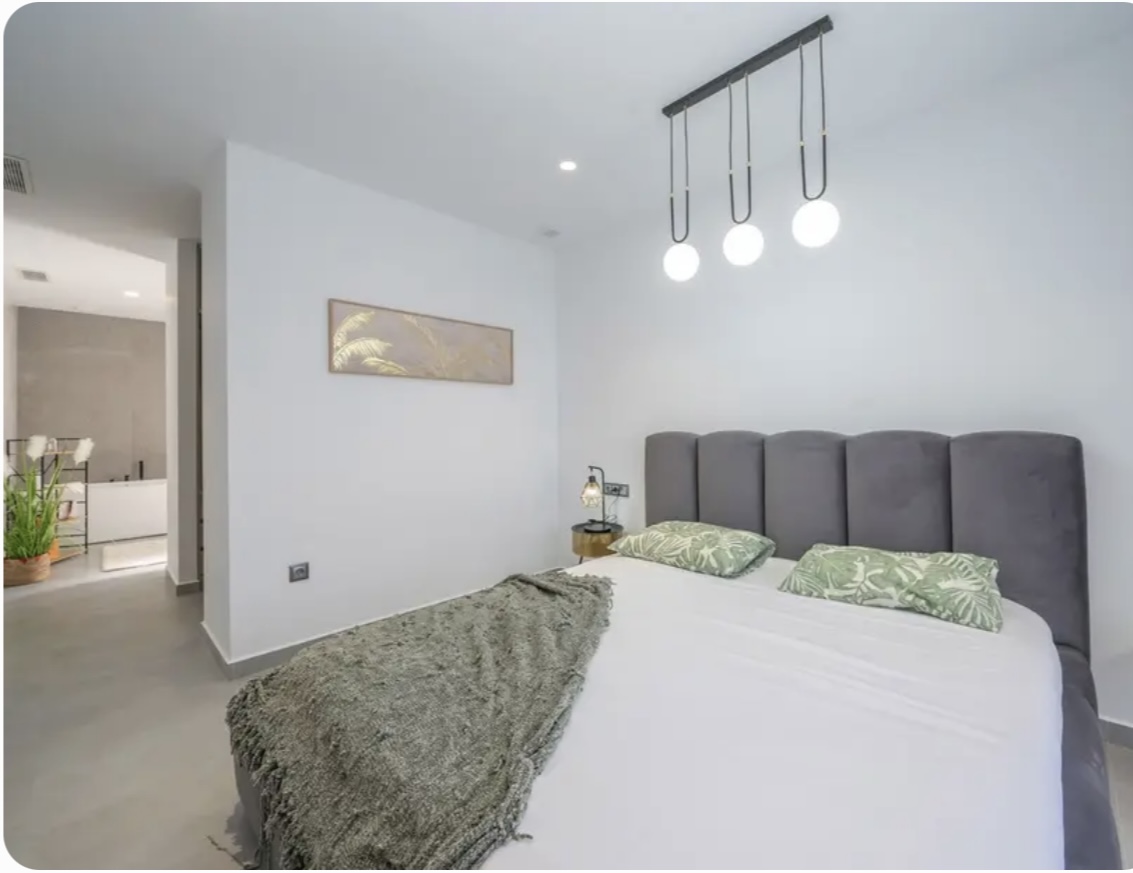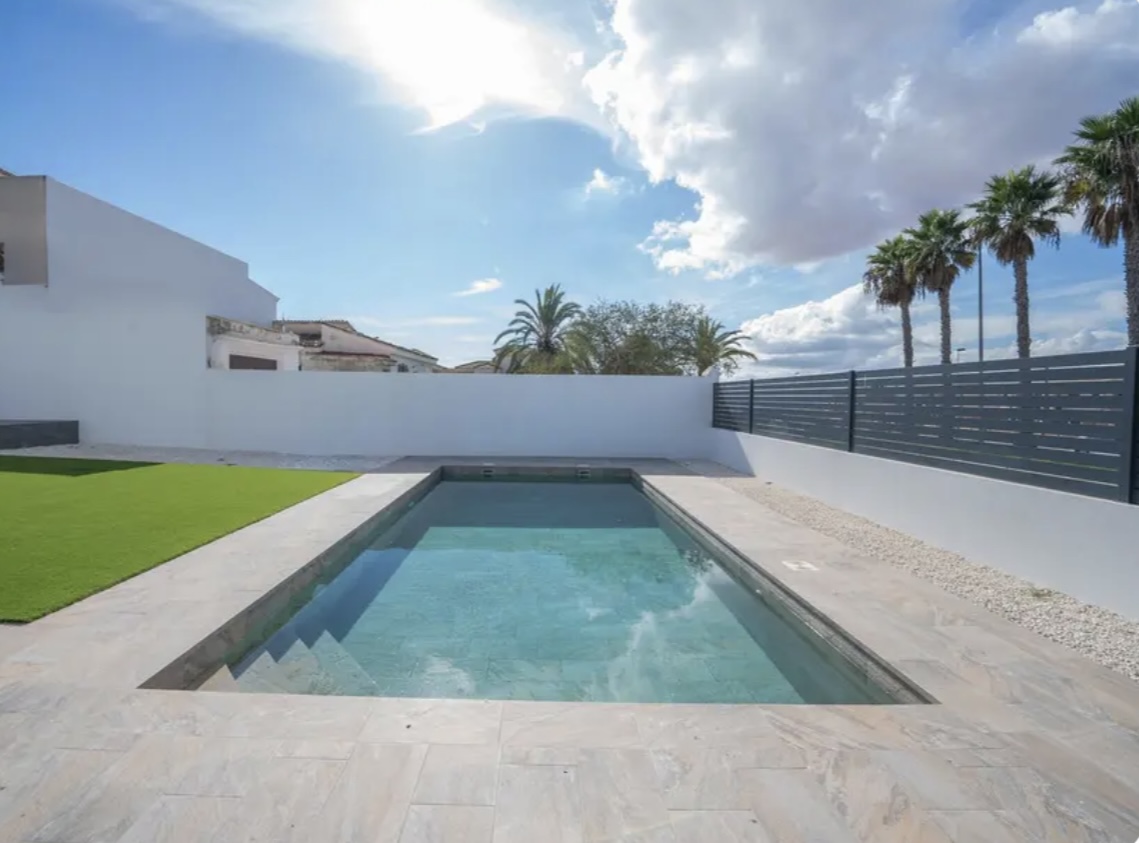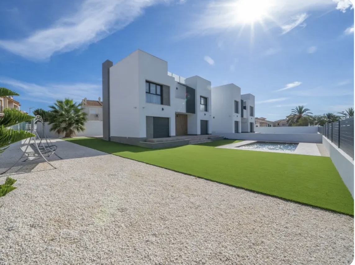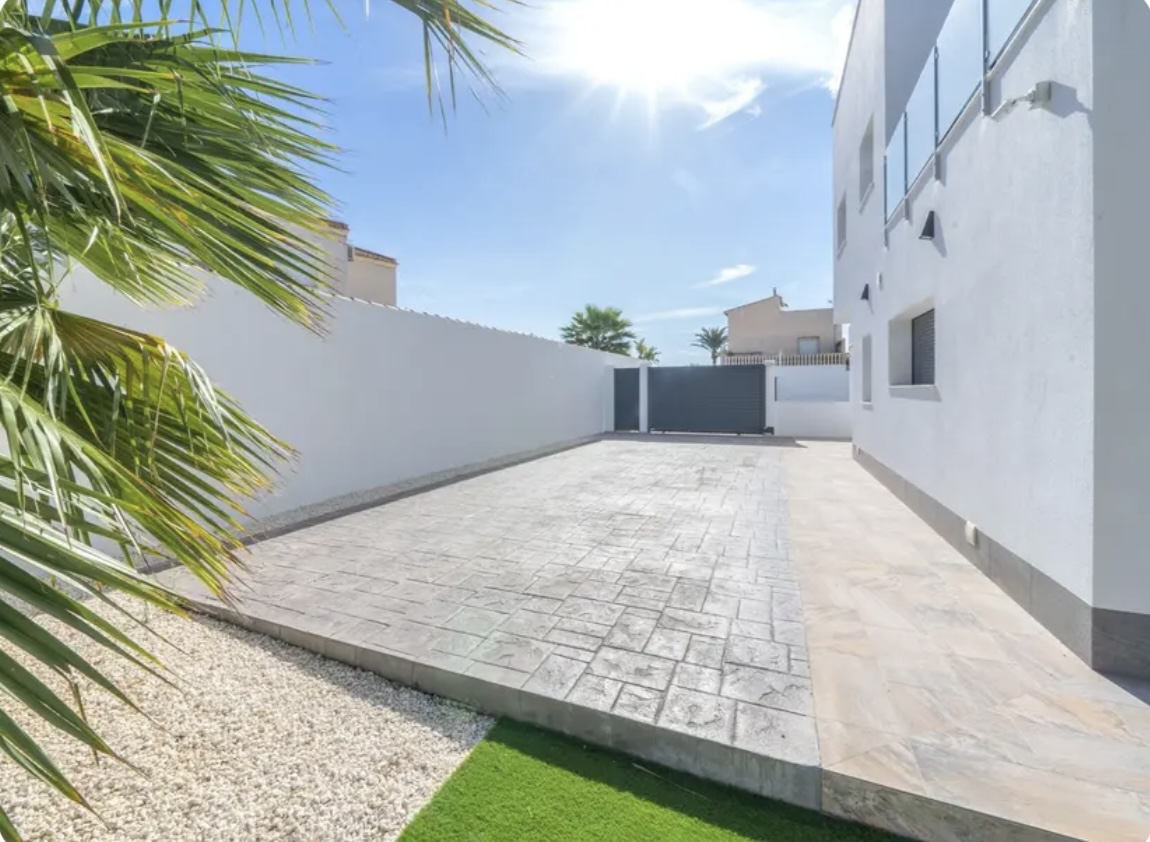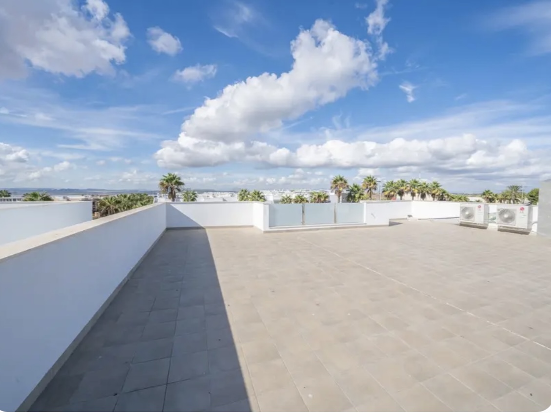 OPORTUNIDAD ÚNICA EN TORREVIEJA! Descubre esta exclusiva villa de obra nueva ubicada en Aguas Nuevas, una de las zonas más prestigiosas de Torrevieja. Totalmente independiente, la propiedad se asienta sobre una parcela de 850 m², y cuenta con piscina privada y amplio aparcamiento exterior en parcela para más de 8 vehículos. Con 368 m² construidos, esta impresionante villa ofrece 5 dormitorios dobles, 4 baños completos y 1 aseo, garantizando espacio y confort para toda la familia. Construida con materiales de alta gama, dispone de suelo radiante en ambas plantas y sistema de aire acondicionado por conductos de última generación. En la planta principal, encontrarás un amplio salón-comedor con cocina americana totalmente equipada, lavandería, aseo de cortesía y un dormitorio principal tipo suite, con baño completo que incluye ducha, bañera, gran vestidor y cama king size (2×2 m). La segunda planta ofrece otro salón adicional, cuatro dormitorios y dos baños completos, uno de ellos en suite. Desde esta planta se accede al balcón y al solárium de 120 m², que ofrece impresionantes vistas a la Laguna de las Salinas. La piscina privada, orientada al sureste, garantiza sol durante todo el día, creando el entorno perfecto para disfrutar al aire libre. La villa se vende completamente amueblada y equipada, lista para entrar a vivir.